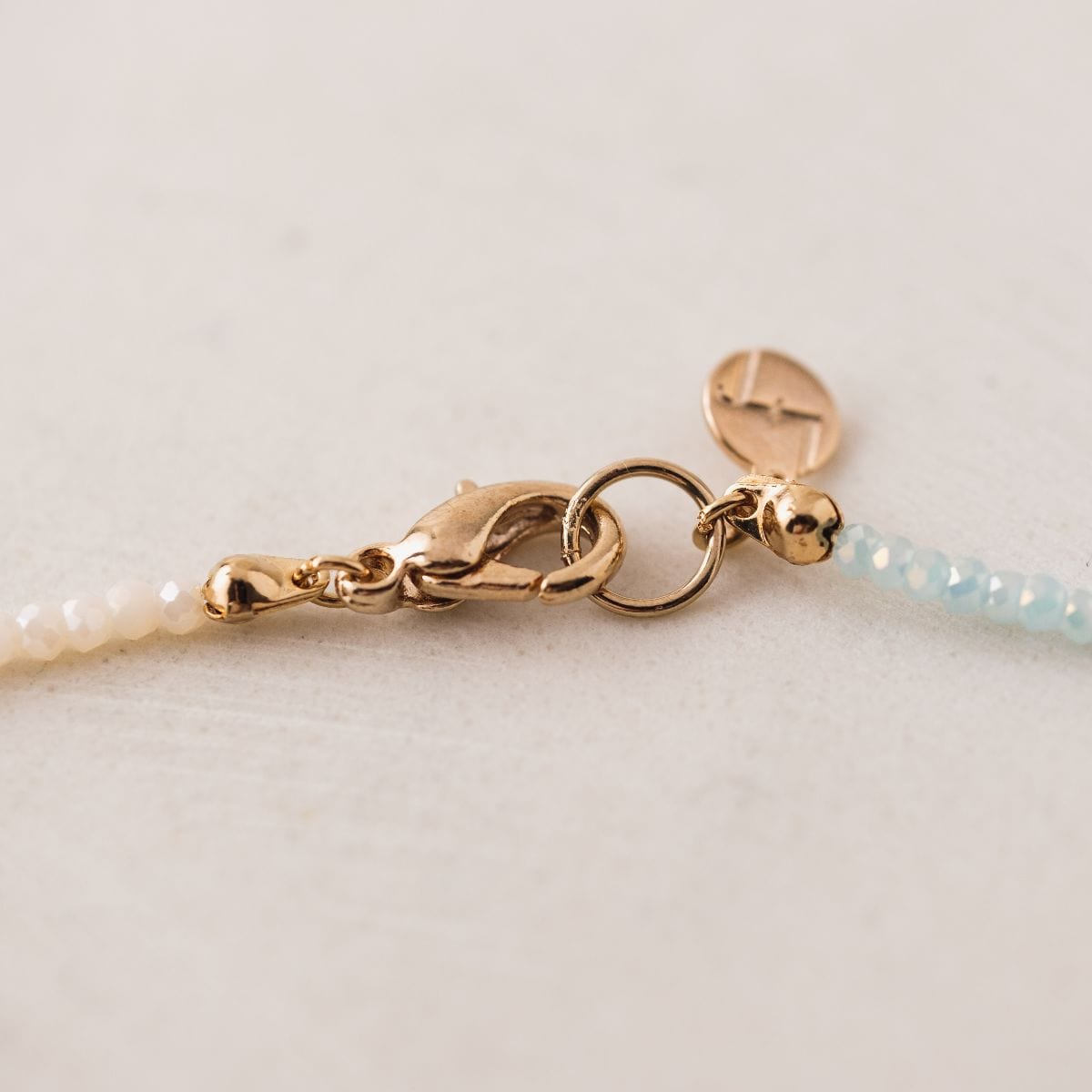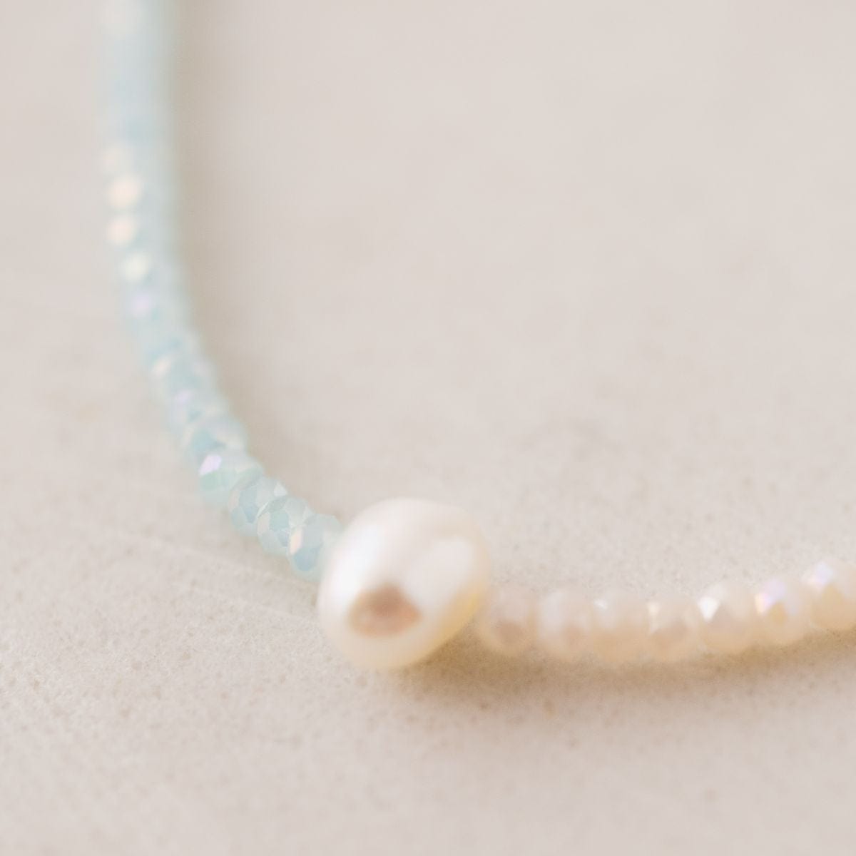 A two-toned beaded necklace adorned with a freshwater pearl centre. Wear this beauty on your next vacation or stay-cation.